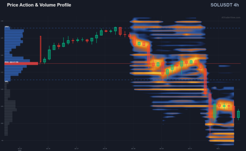 According to the Price Action & Volume Profile chart, Solana has drifted well below its Point of Control (POC), which is currently identified at $117.56. This level represents the price point with the highest traded volume over the observed period and now acts as a significant area of resistance. The chart displays a Value Area High (VAH) above the current price action, while the price has descended toward the Value Area Low (VAL). The inability of the asset to reclaim the POC suggests that sellers are currently in control of the immediate trend. The recent candles on the 4-hour chart show a sharp decline from the $128 region, stabilizing momentarily in the lower bounds of the visible range.