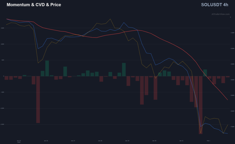 An examination of the Momentum & CVD & Price chart further reinforces the bearish outlook observed in this Solana price analysis. The Cumulative Volume Delta (CVD), depicted by the blue and yellow lines, has entered a steep downtrend, diving deep into negative territory. This divergence indicates aggressive market selling, where sell orders are consuming available liquidity on the order book. The trajectory of the CVD has not yet shown signs of flattening, suggesting that the selling momentum remains active.