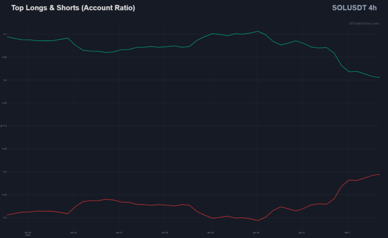 Sentiment among traders is also evolving. The Top Longs & Shorts (Account Ratio) chart shows a convergence between the percentage of long and short accounts. The green line, representing long positions, has declined from highs near 70% to approximately 60%, while the red line (shorts) has risen correspondingly. This shift in the account ratio suggests that retail sentiment is becoming less bullish, or that bullish traders are capitulating in the face of sustained downside pressure.