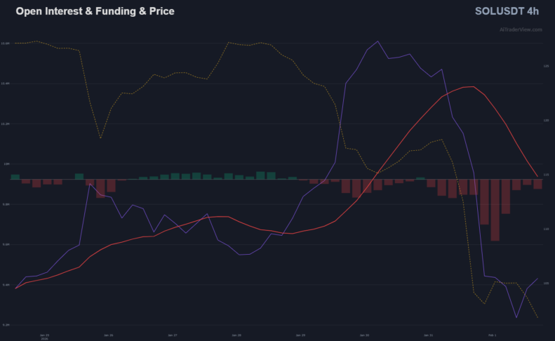The correlation between price movement and derivatives data provides further context to the current Solana price analysis. The Open Interest & Funding & Price chart illustrates a significant contraction in Open Interest (OI), represented by the purple line. This metric peaked in late January but has since seen a sharp decline, coinciding with the downward price trajectory. A drop in OI during a price decrease often indicates that long positions are being liquidated or voluntarily closed, rather than new short positions driving the market alone.