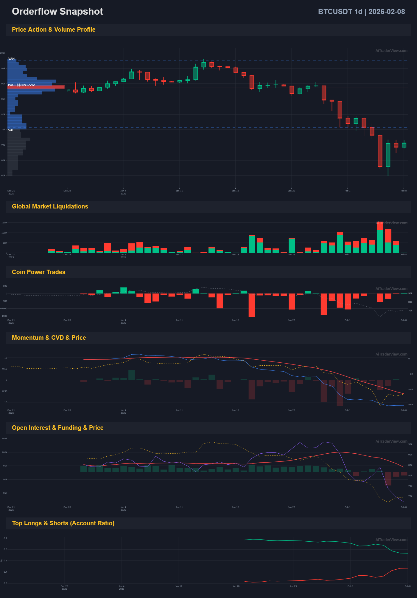 The cryptocurrency market has experienced significant volatility leading up to February 8, 2026. In this Bitcoin Price Analysis, we dissect the current market structure for BTCUSDT using both high-timeframe (1-day) and lower-timeframe (4-hour) charts. By combining standard Technical Analysis (TA) with advanced Orderflow data, we aim to provide a factual overview of the liquidity landscape, momentum shifts, and key support and resistance levels. Disclaimer: This article is for informational purposes only and does not constitute financial advice, investment recommendations, or an endorsement of any digital asset. Digital assets are highly volatile and risky.
