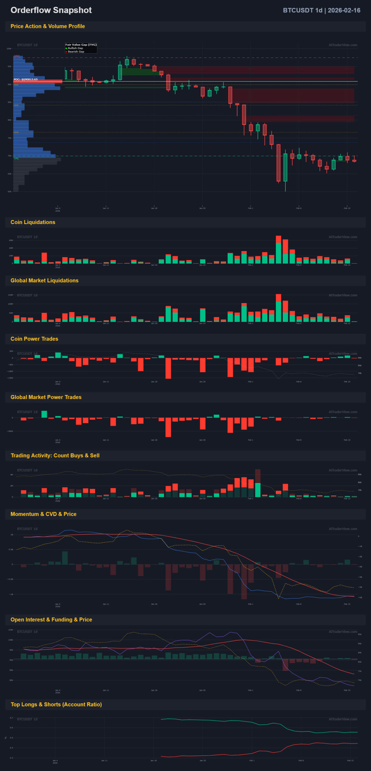 • CVD (Cumulative Volume Delta): On the 1D chart (the ‘Momentum & CVD’ panel), this is extremely bearish. The orange CVD line is diving aggressively, much steeper than the price itself. This is a classic bearish divergence: aggressive market selling (sells hitting bids) is occurring, while price is being artificially propped up by passive limit orders. Once those limit orders are exhausted, price often drops further.