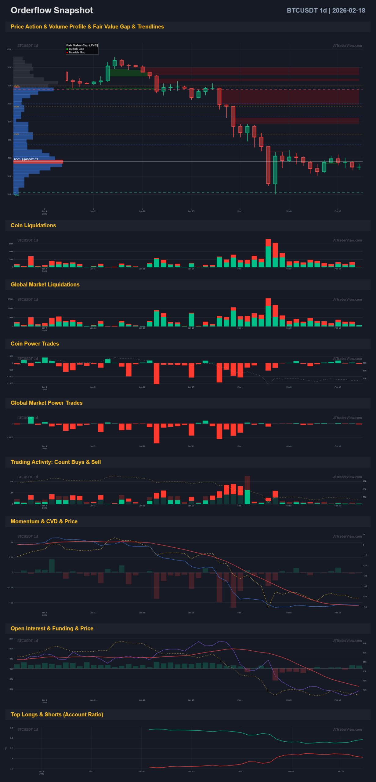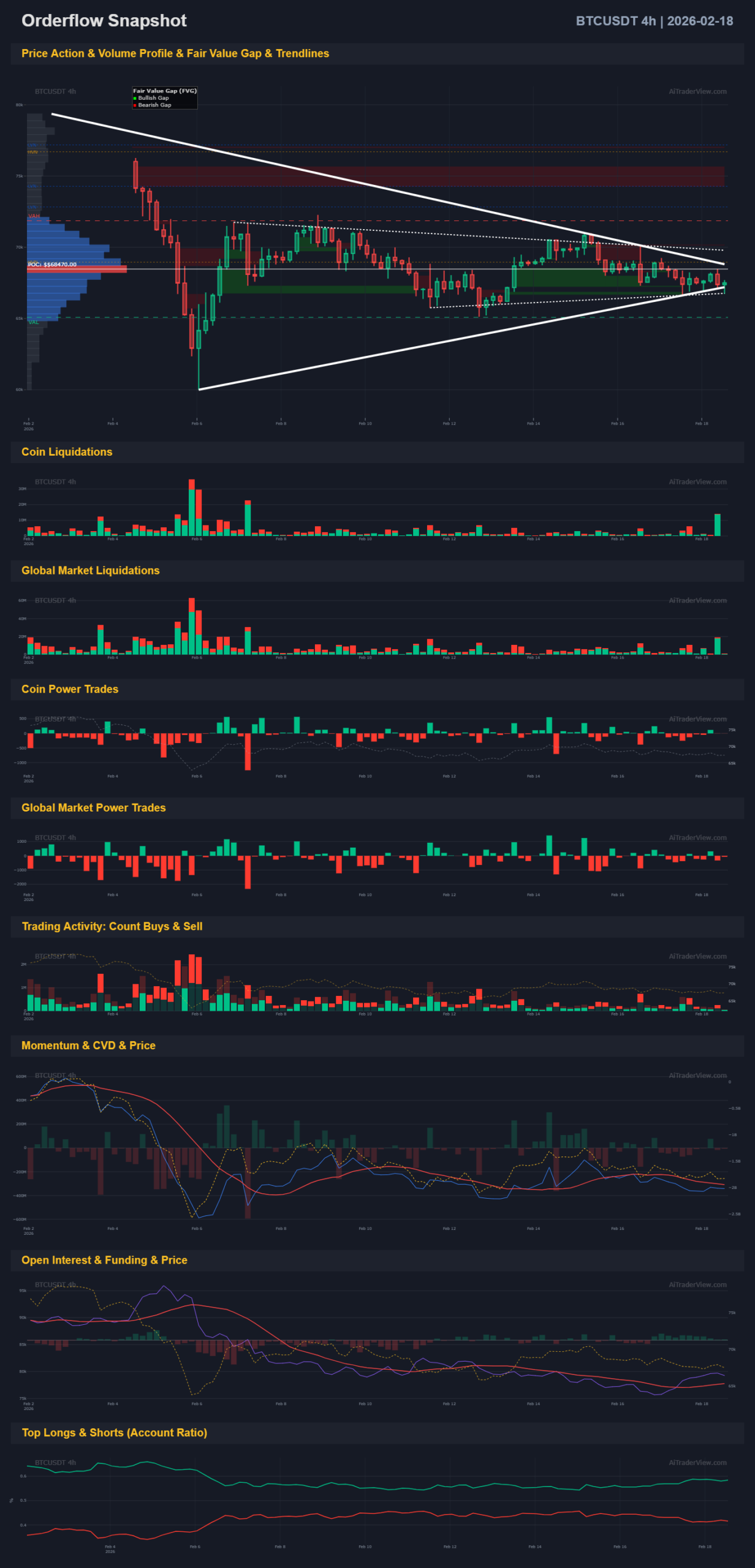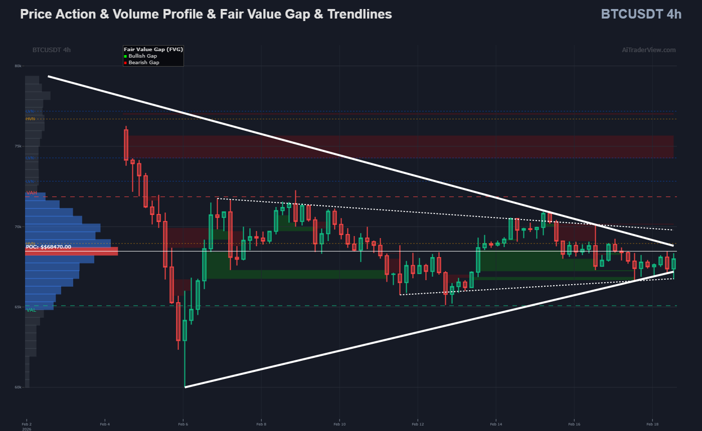 • 4H Timeframe: The price is consolidating within a symmetrical triangle (pennant). The 4H POC (Point of Control) sits around 69,170. The price is currently oscillating directly around this POC, indicating indecision and acceptance of this price level in the short term.