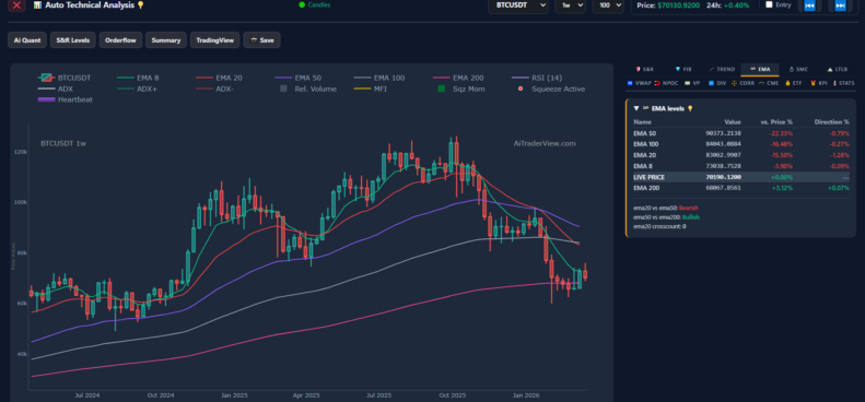 - EMAs: Price is trading below the short and mid-term EMAs (8, 20, 50, 100). The status indicator explicitly states that the EMA 20 vs EMA 50 cross is bearish. The price is currently only being supported by the long-term EMA 200 ($68,067).