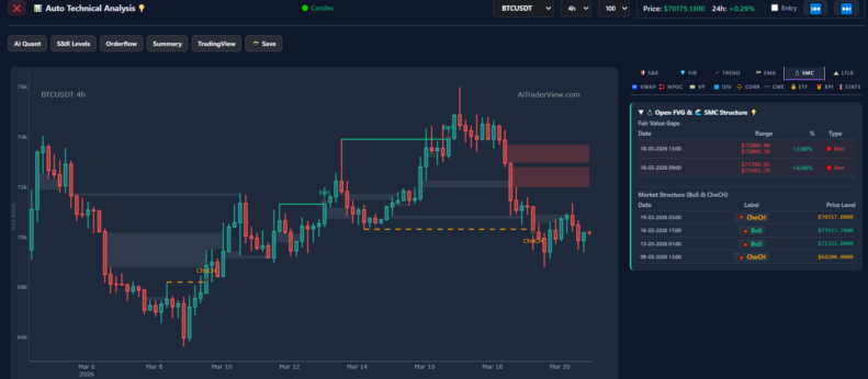 - SMC (4H): We observe a clear Bearish Change of Character (ChoCH) at $70,317. Above the current price, there are two unfilled Bearish Fair Value Gaps (FVGs) in the $72,000-$72,800 and $72,981-$73,700 zones. These zones will act as heavy resistance (supply) on any upward move.