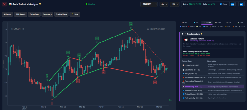 - Trend: The 4H chart shows a Broadening Formation (HH + LL), which indicates increasing volatility and indecision (often seen near reversals). Conversely, the 1D Trend indicator is more constructive, detecting an Uptrend (HH + HL), pointing to underlying buying pressure on a higher timeframe.