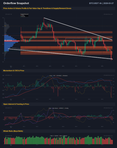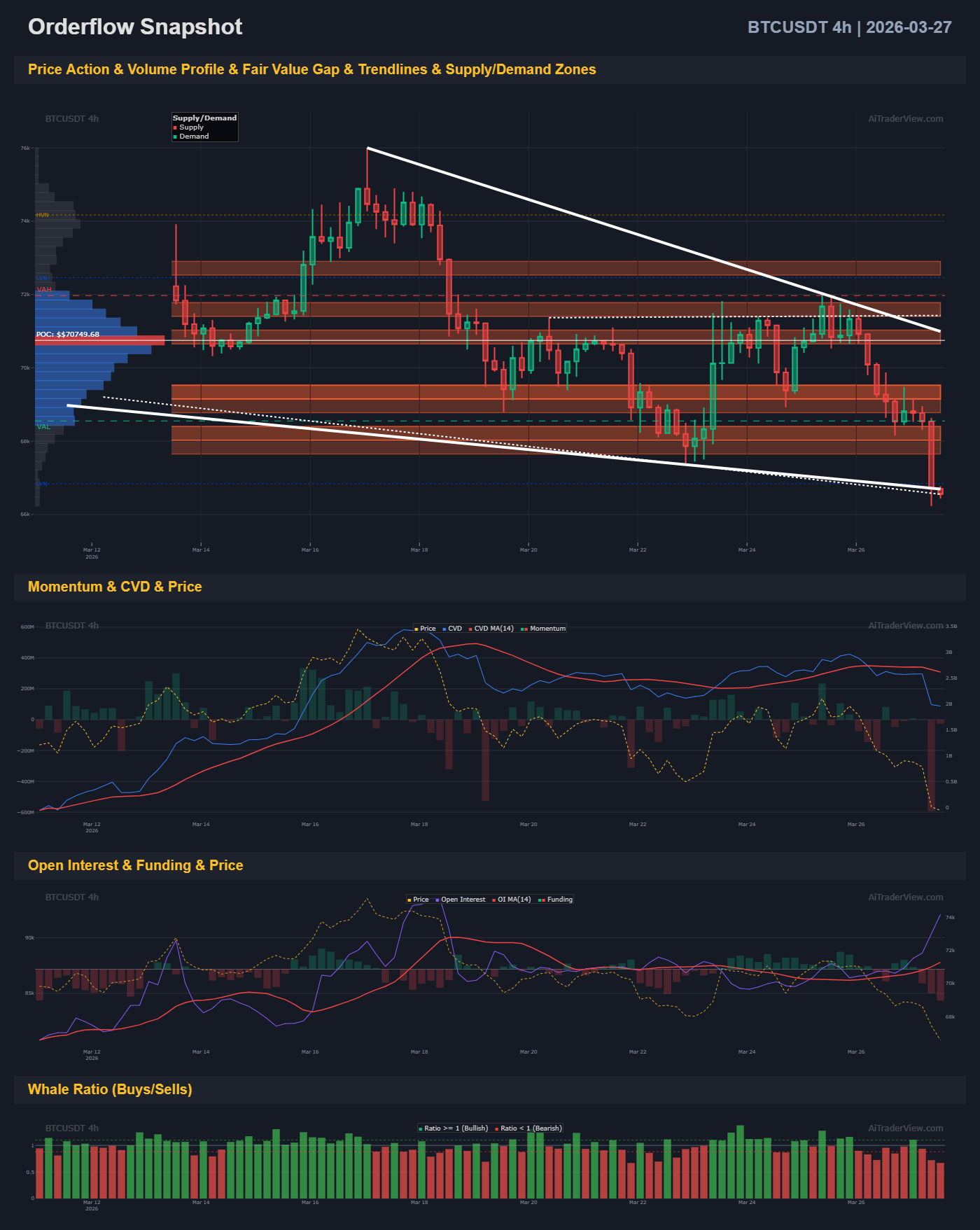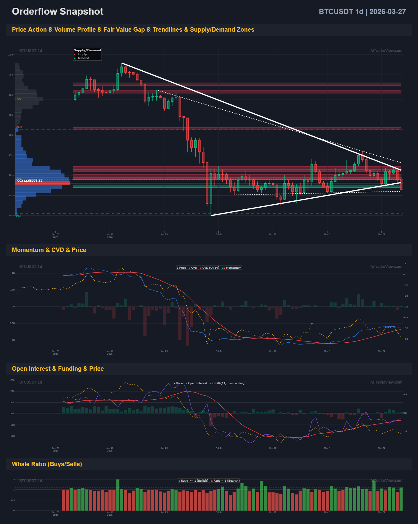 These Orderflow Snapshots for BTC/USDT (dated March 27, 2026) reveal a market standing at a major crossroads. Following a period of correction, we are witnessing a high-stakes “tug-of-war” between aggressive sellers and opportunistic buyers within a tightening range.