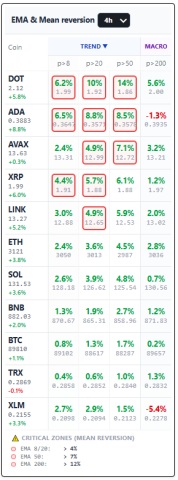 To identify market outliers efficiently, the Crypto Heatmap Statistics section filters real-time data. This allows users to view daily gainers, losers, and volatility leaders (ADX) instantly, providing a quick overview of market sentiment without scanning individual charts.