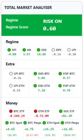 - Regime Scoring: Calculates “Regime Scores” to define the current trend environment.