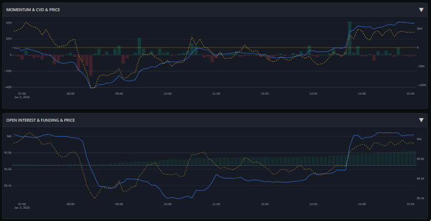 - CVD & Momentum: Tracks Cumulative Volume Delta to assess buyer/seller aggression.
