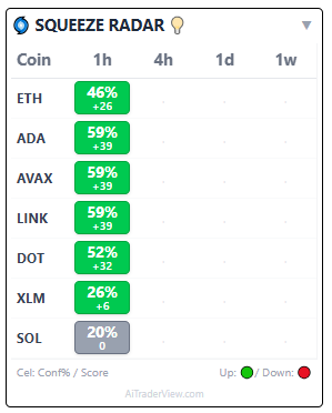 The recent upward movement appears driven by mechanical and statistical factors rather than a shift in long‑term trend. Price was trading significantly below the 200 EMA, and multiple oscillators (Weekly Stochastics at 2, MFI at 4) reached extreme levels associated with seller exhaustion. The 1‑hour Squeeze Radar (46% green) reflects short‑term volatility expansion following this oversold condition.