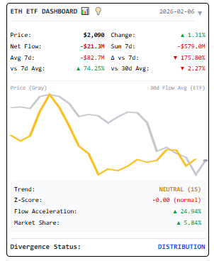 The Insight: Finally, we look at the fundamental flow of funds via ETFs. The Value: The dashboard shows a Net Flow of -$21.3M, indicating institutional distribution (selling). However, the “vs 7d Avg” is up +74.25%, which implies that while selling continues, the intensity of the selling pressure might be decreasing compared to the previous week.