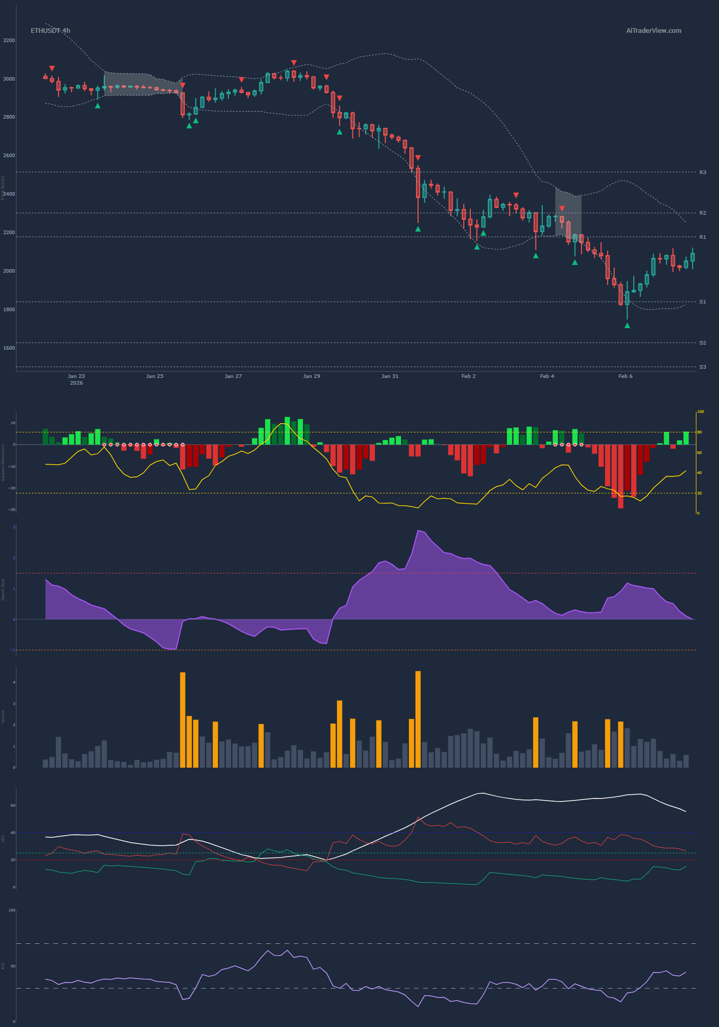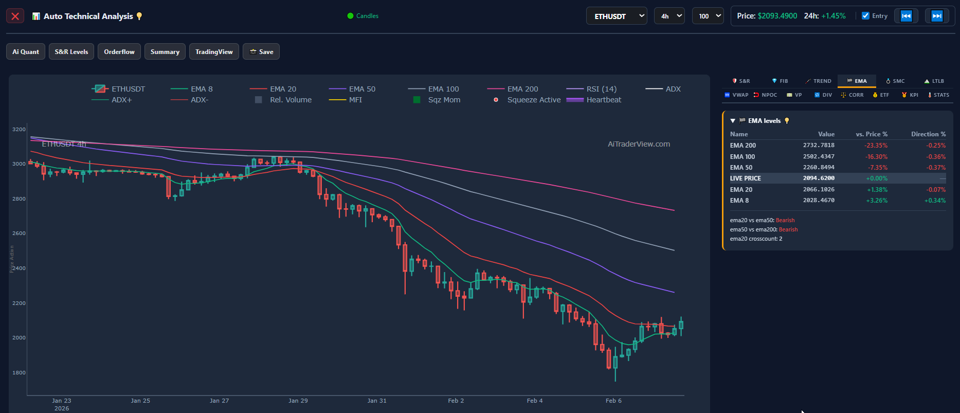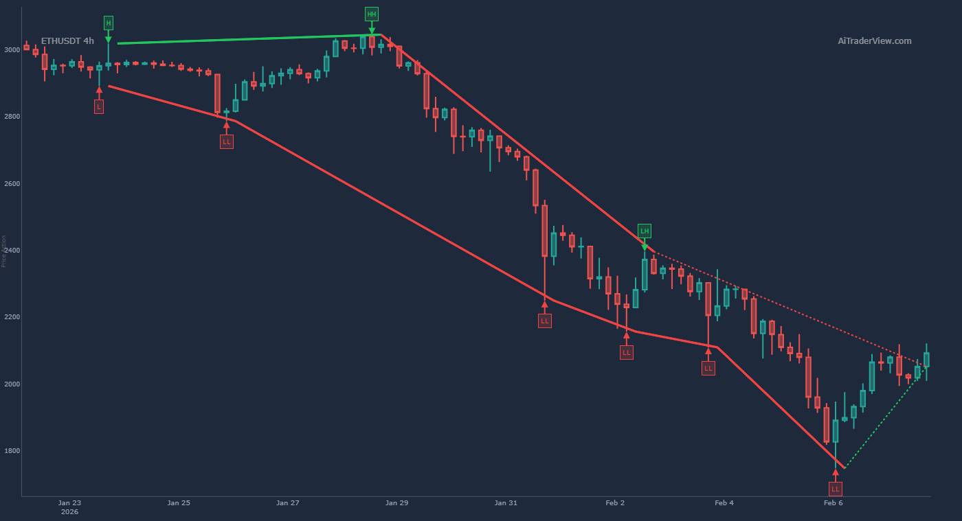 What the chart shows: We begin with the standard 4-hour chart. The trend is undeniably bearish. We observe a steep capitulation where ETH dropped from the $3,000 region to a low near $1,800. Currently, the price is staging a minor relief bounce, trading around $2,084.