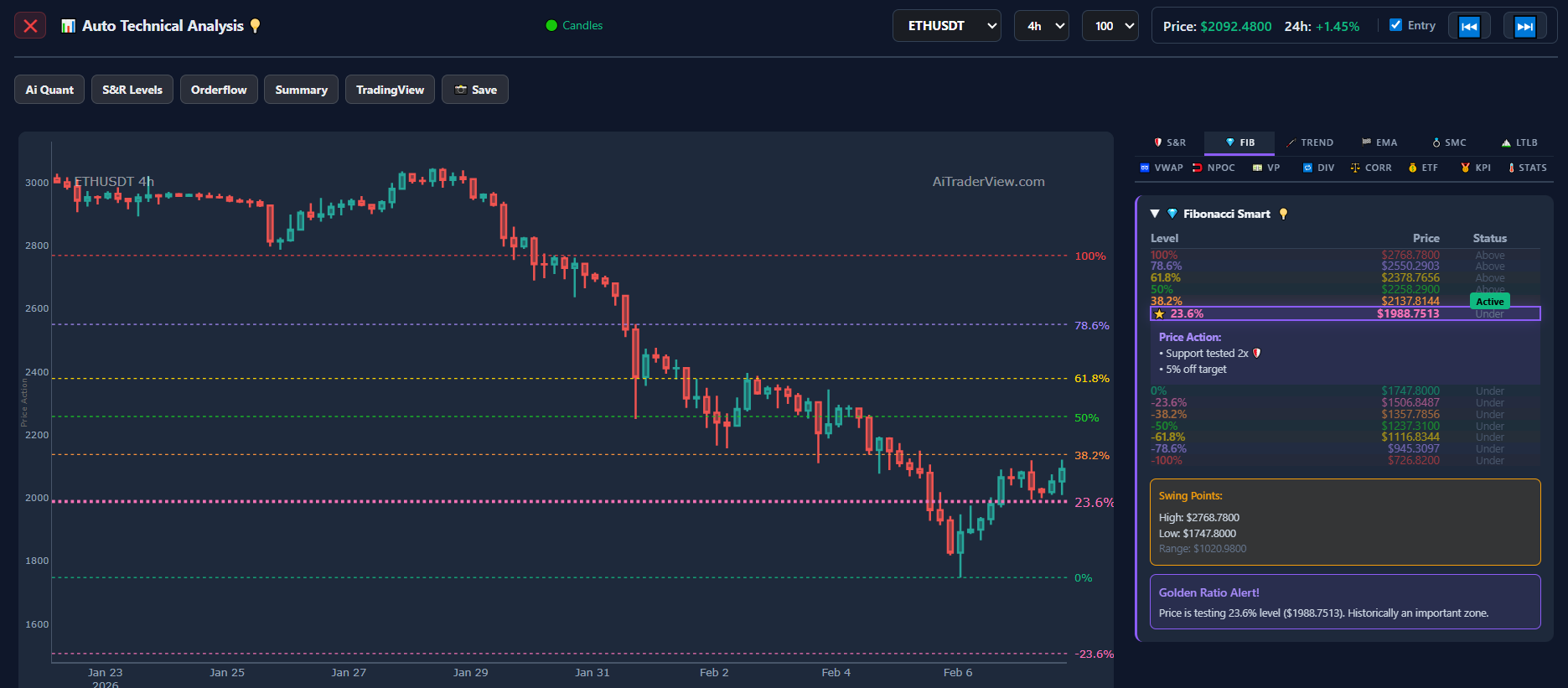 - The Context: This specific level is highlighted as an “Active” zone. If ETH cannot hold above this 23.6% level, the bounce is technically invalid. Without this image, $1,988 is just a number; with it, we know it’s the minimum requirement for a continued recovery toward the 38.2% target ($2,137).