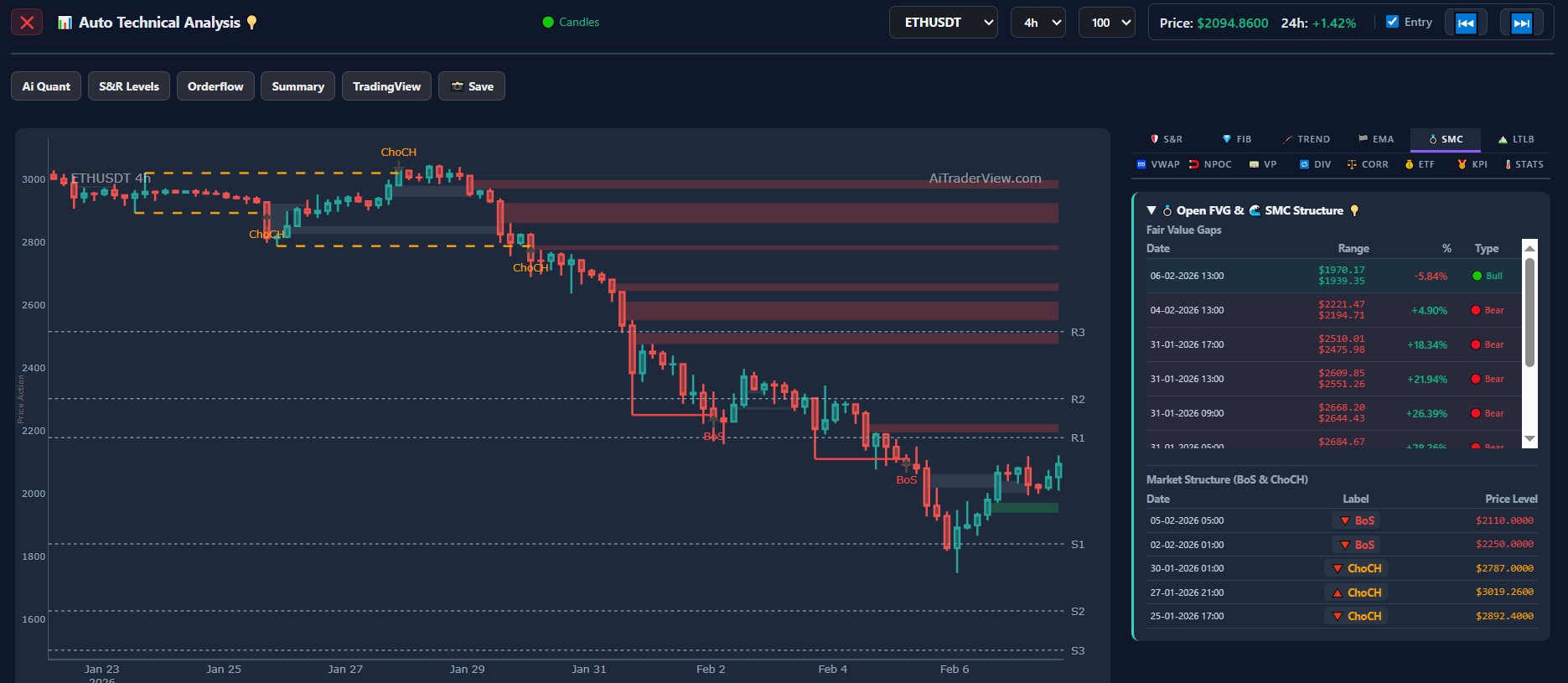 What AiTraderView adds: This layer reveals institutional footprints: Fair Value Gaps (FVG), Breaks of Structure (BoS), and Change of Character (ChoCH).