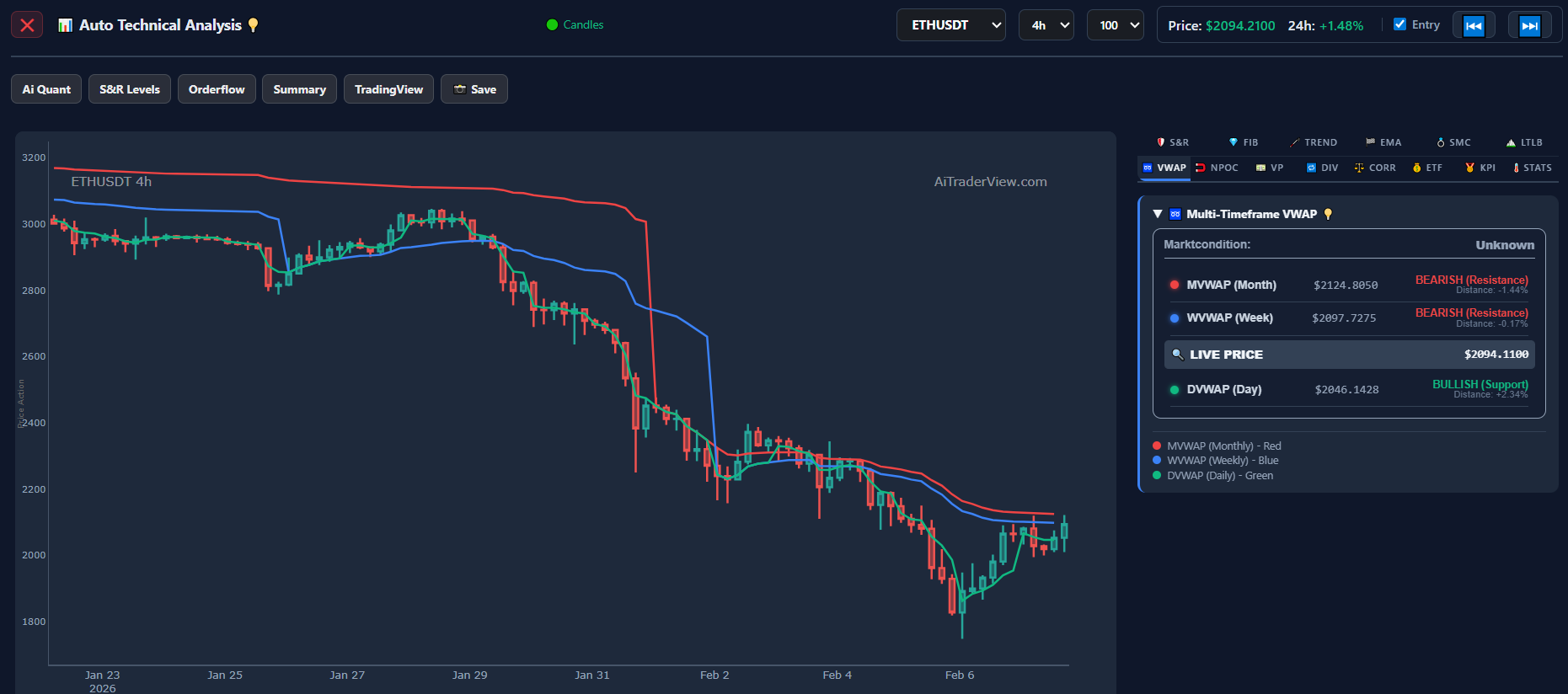 - The New Insight: A divergence is visible. The Daily VWAP (Green) is at $2,046, providing short-term support. However, the Weekly (Blue) and Monthly (Red) VWAPs are trending downwards above the price.