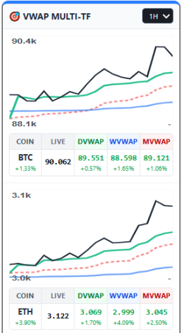 - Utility: This comparison helps analysts determine if a price movement is idiosyncratic (isolated to one asset) or part of a broader sector rotation where multiple assets reclaim their VWAP levels simultaneously.